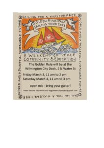Guest Speakers: Gerry Condon, Veterans For Peace, Golden Rule Committee Chair, raised in San Mateo and Dr. Dylan Spaulding, Senior Scientist, Global Security Program, Union of Concerned Scientists. Dylan will also help crew the Golden Rule back to Humboldt Bay at the end of August.