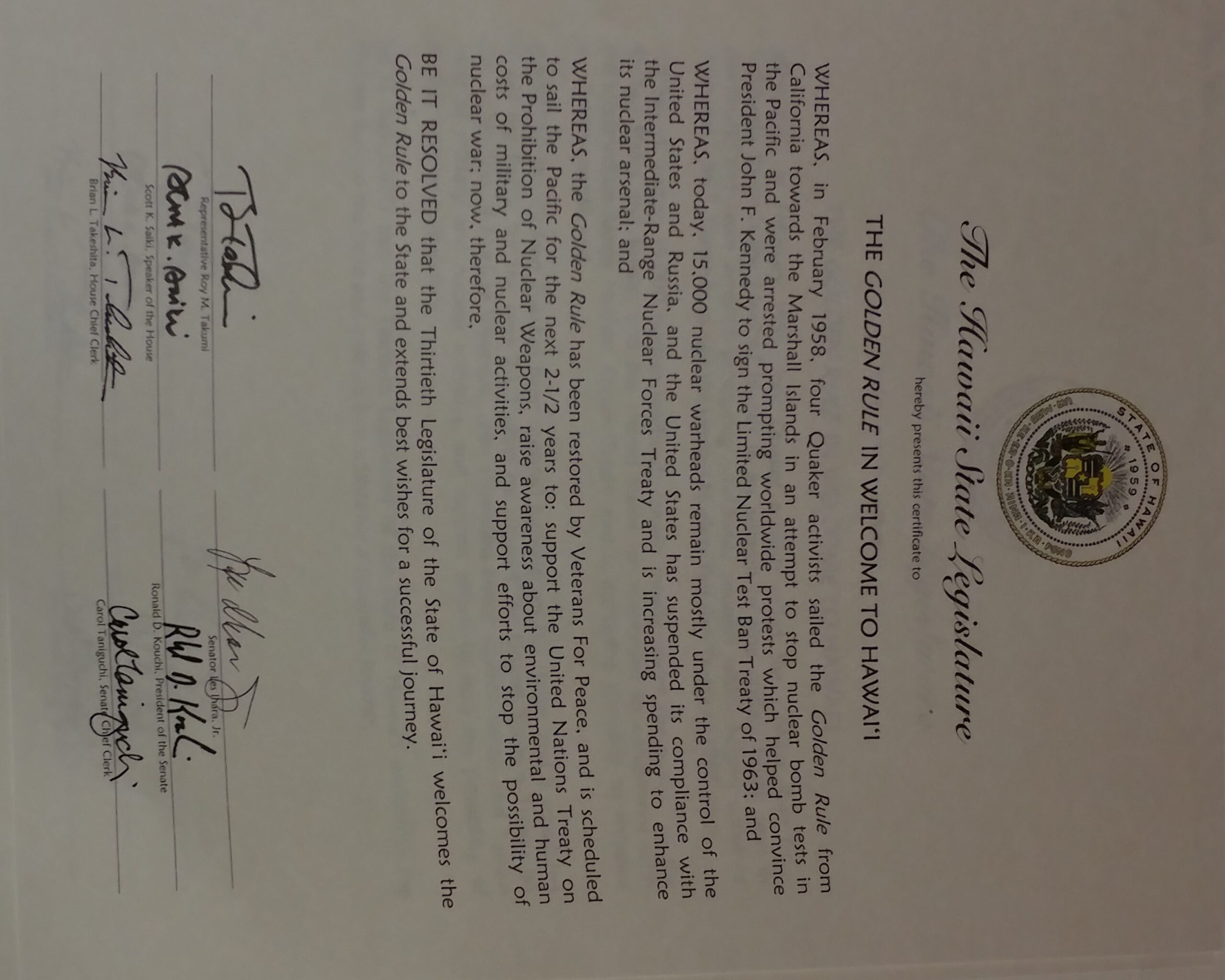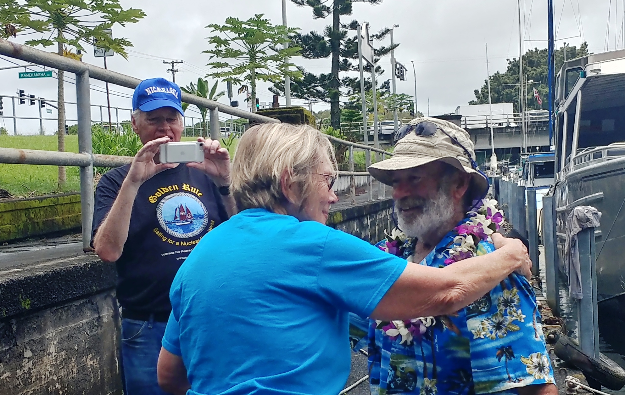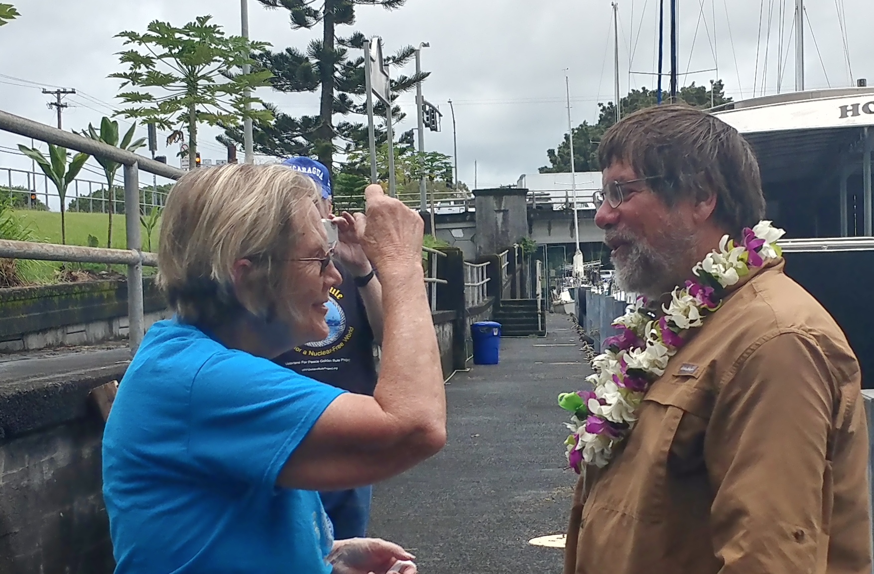 29 Oct Arriving in Hawai’i pictures Posted at 00:31h in Uncategorized by Helen Jaccard 0 Comments 0 Likes Share Golden Rule arrives in Hilo, Hawaii! Ann Wright brought beautiful leis. Helen Jaccard See Full Bio