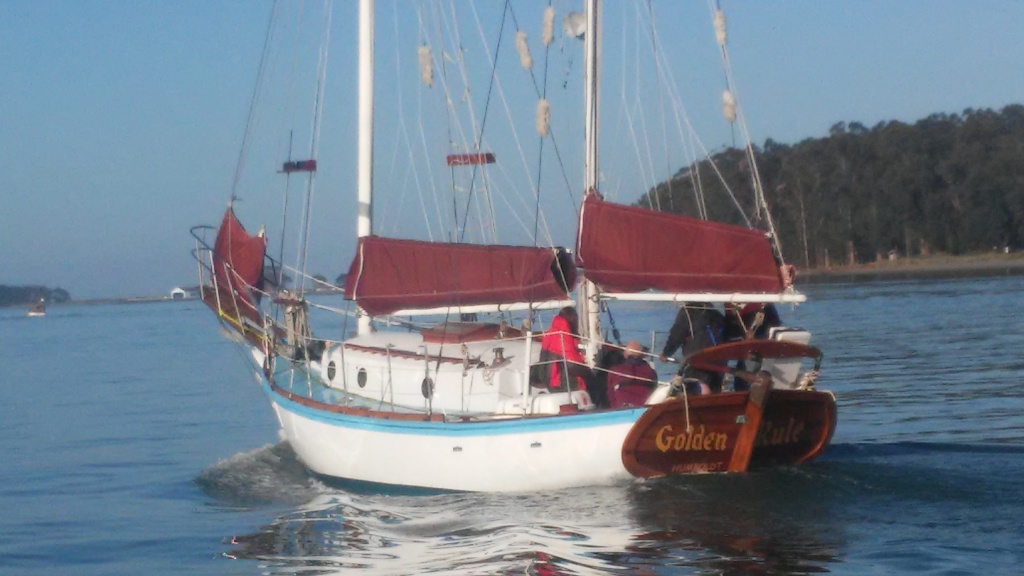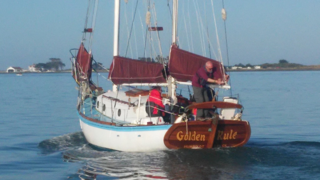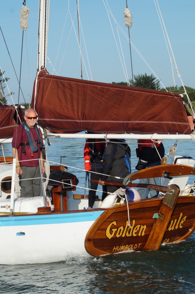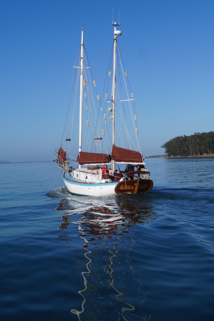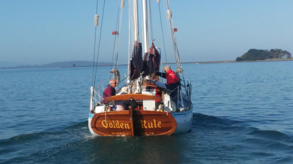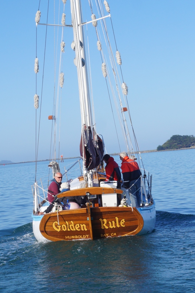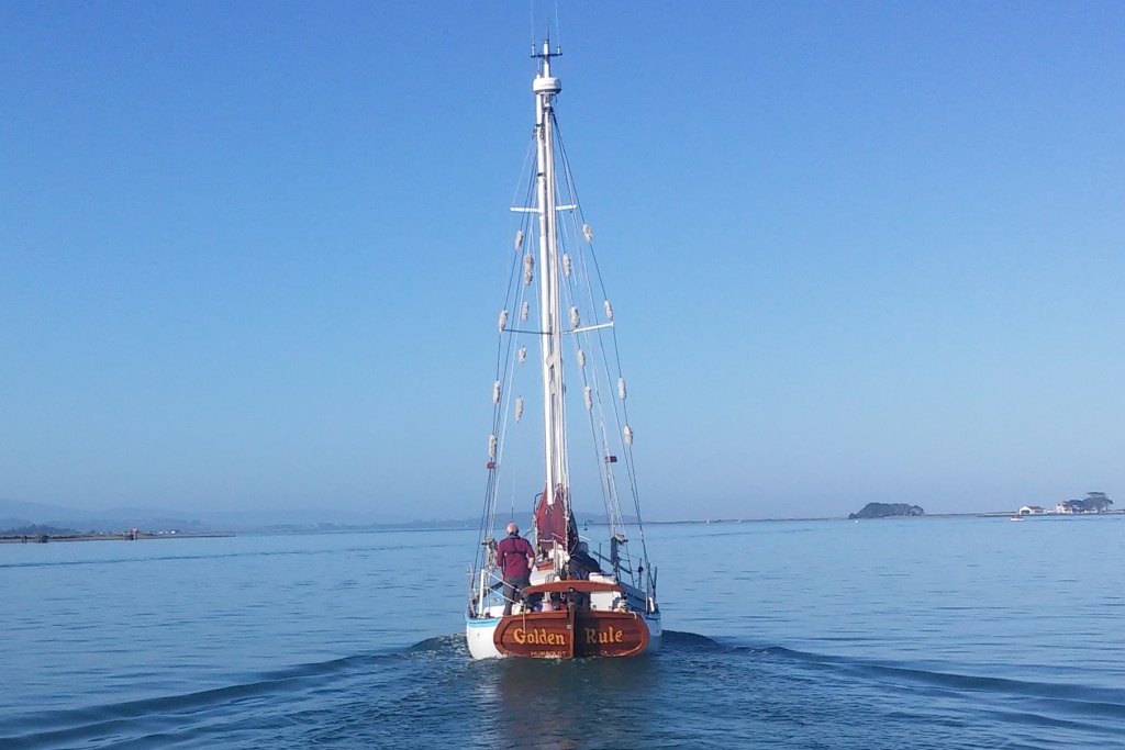 It was glassy-smooth at 7:30 am on Tuesday May 31 when the Golden Rule and her new crew cast off from the dock of the Eureka Public Marina. Several volunteers saw her off and the Ajax tug boat followed as she motored down the bay and out to sea.