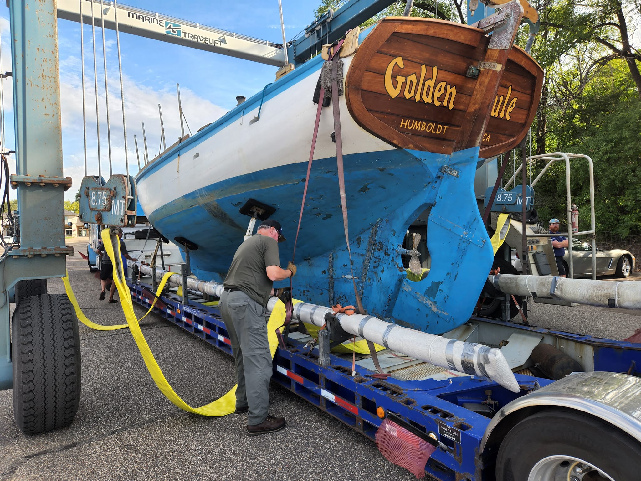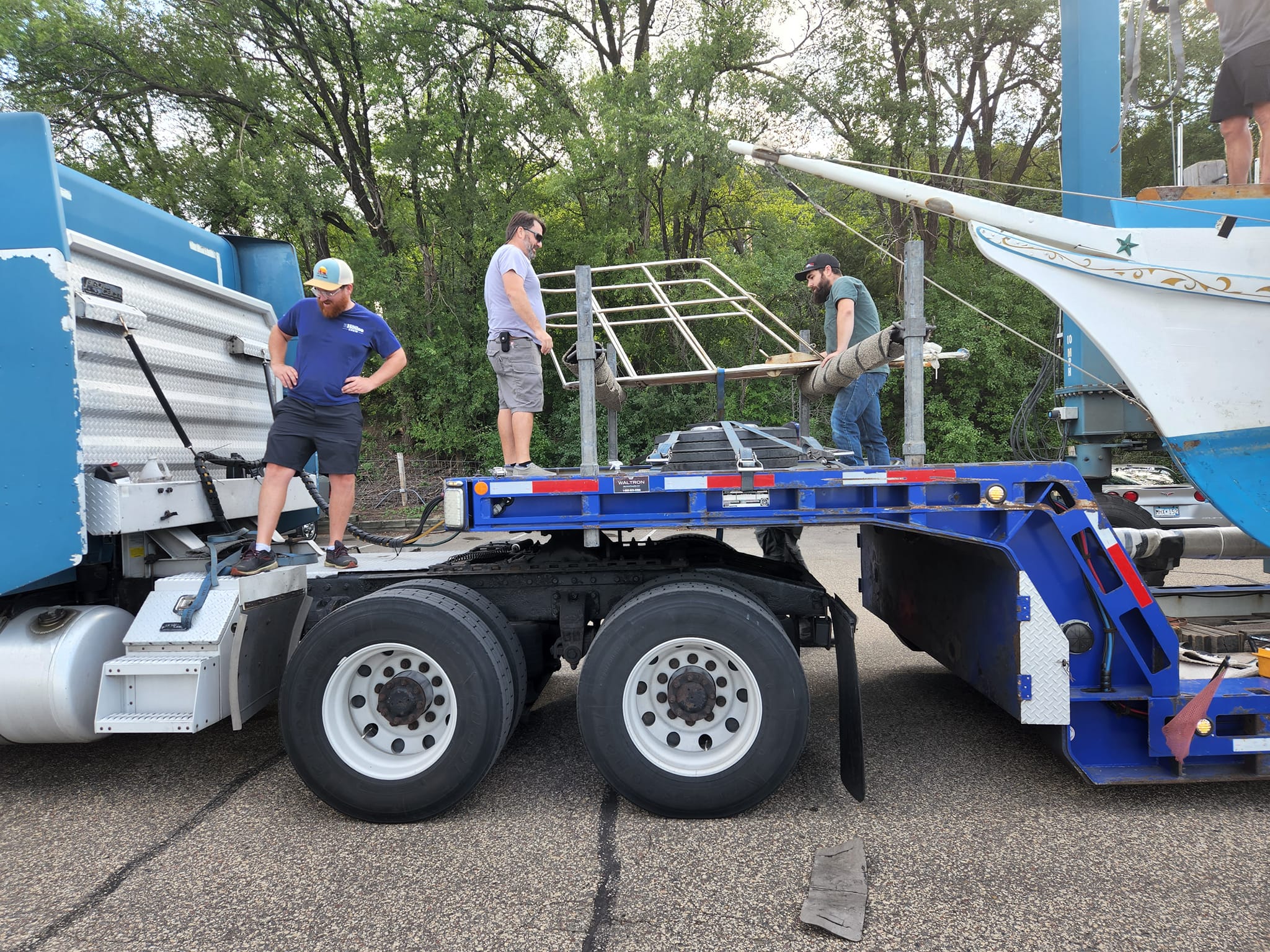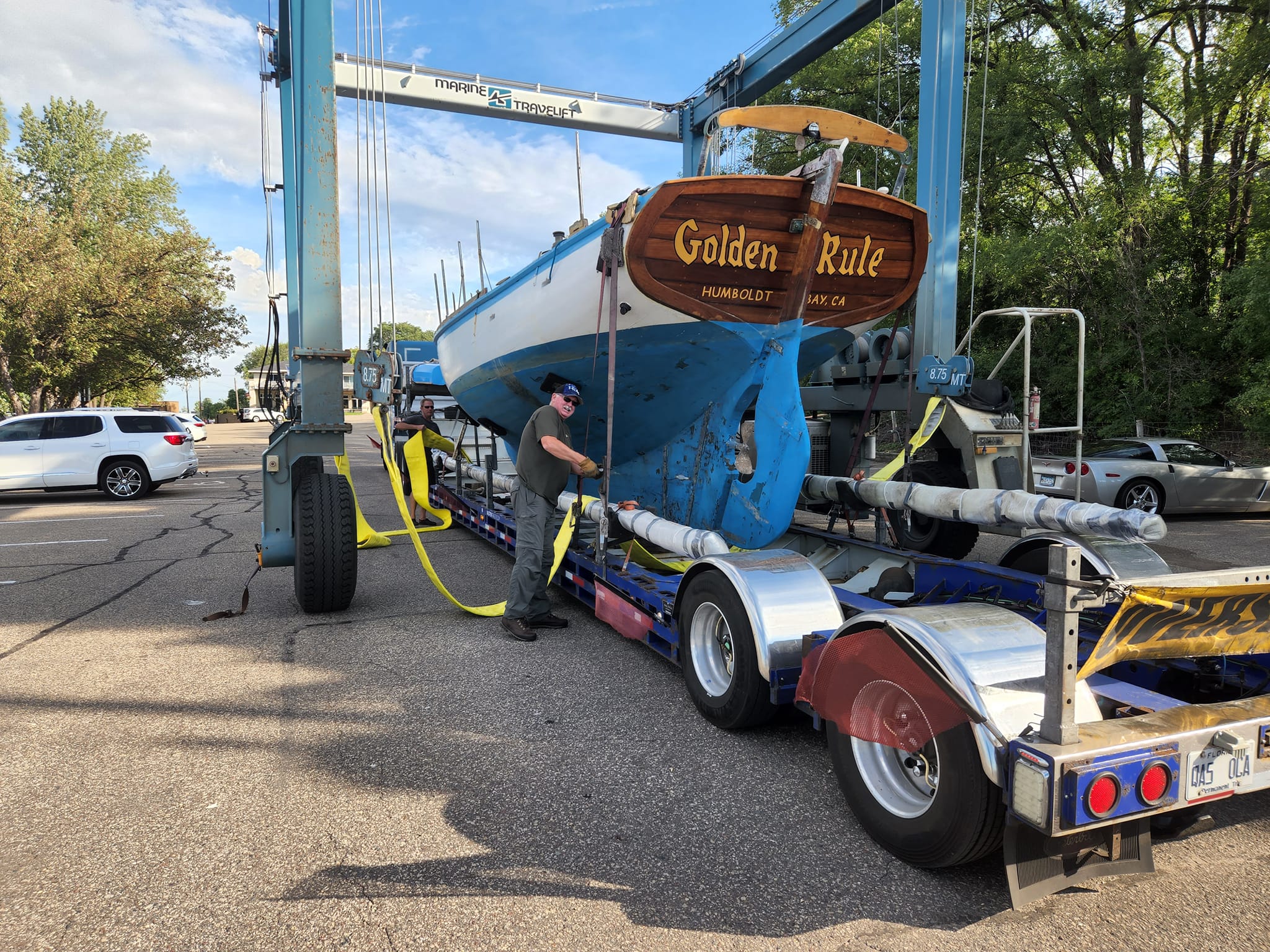 Golden Rule arrived at the St Croix Marina in Hudson, WI around 9 am on Sept 2 as planned. Dave, other boat yard people, Collin Mueller and Justin Farner got the pulit and rowboat off and we all moved the masts off of the truck.