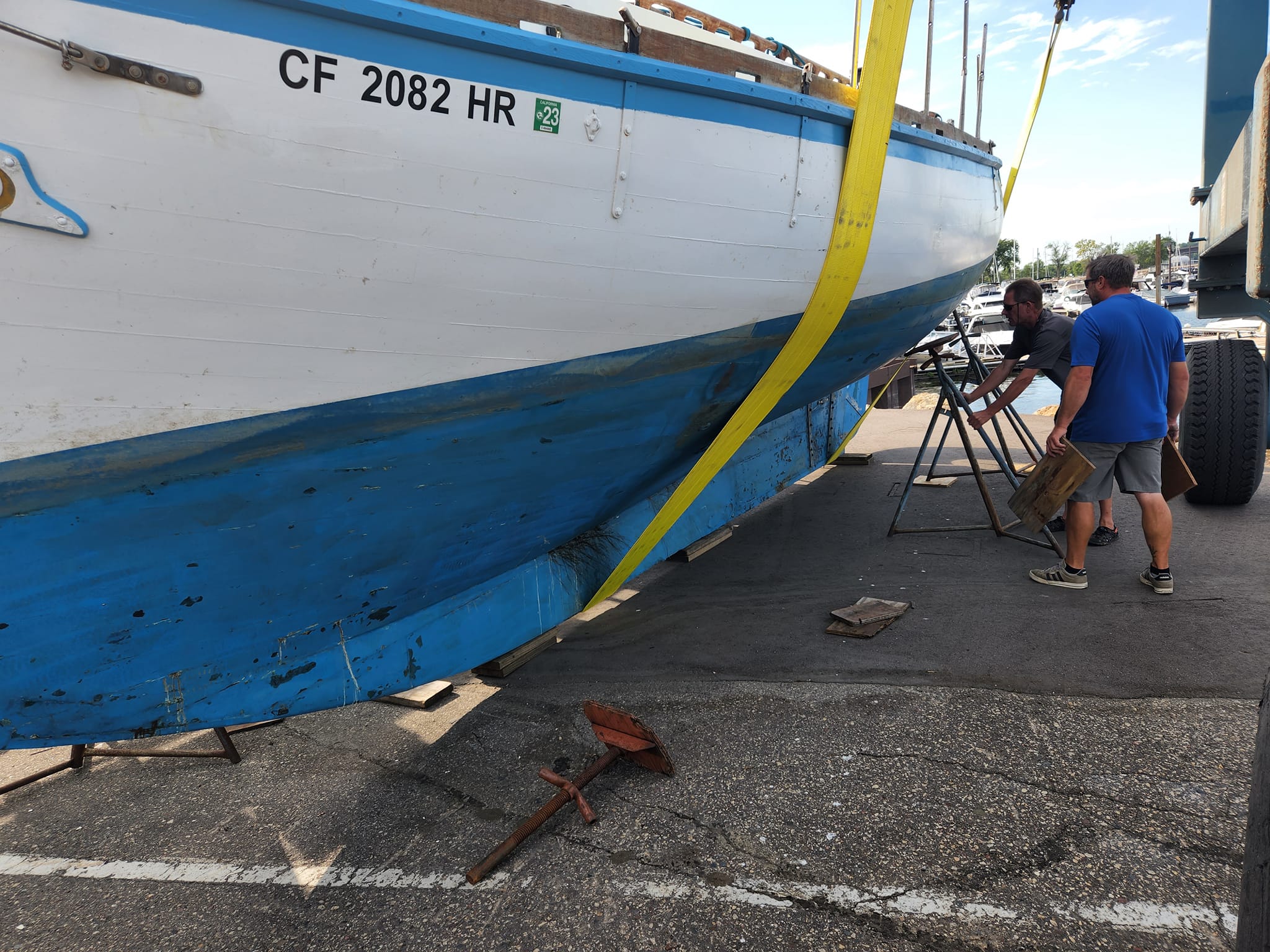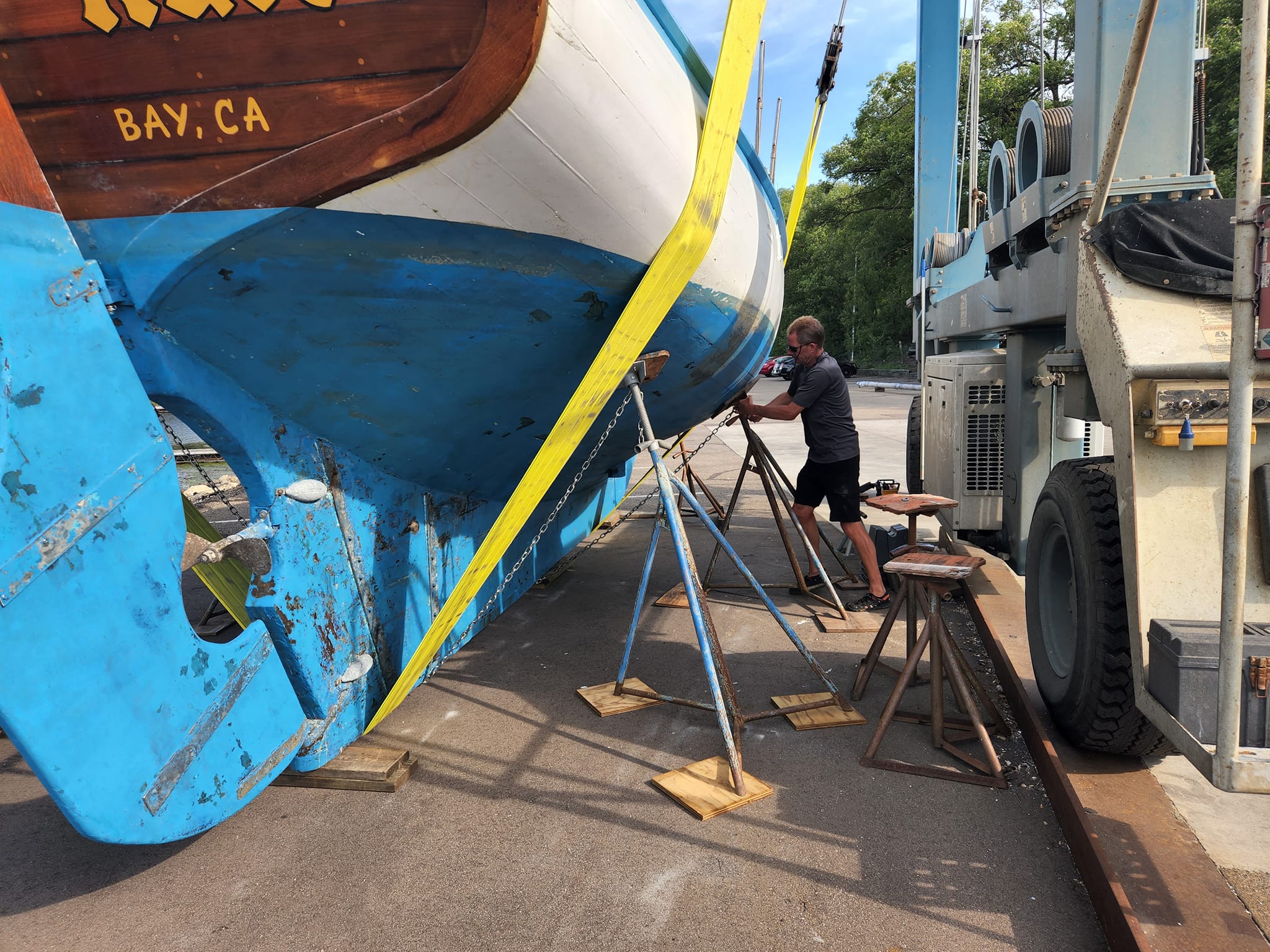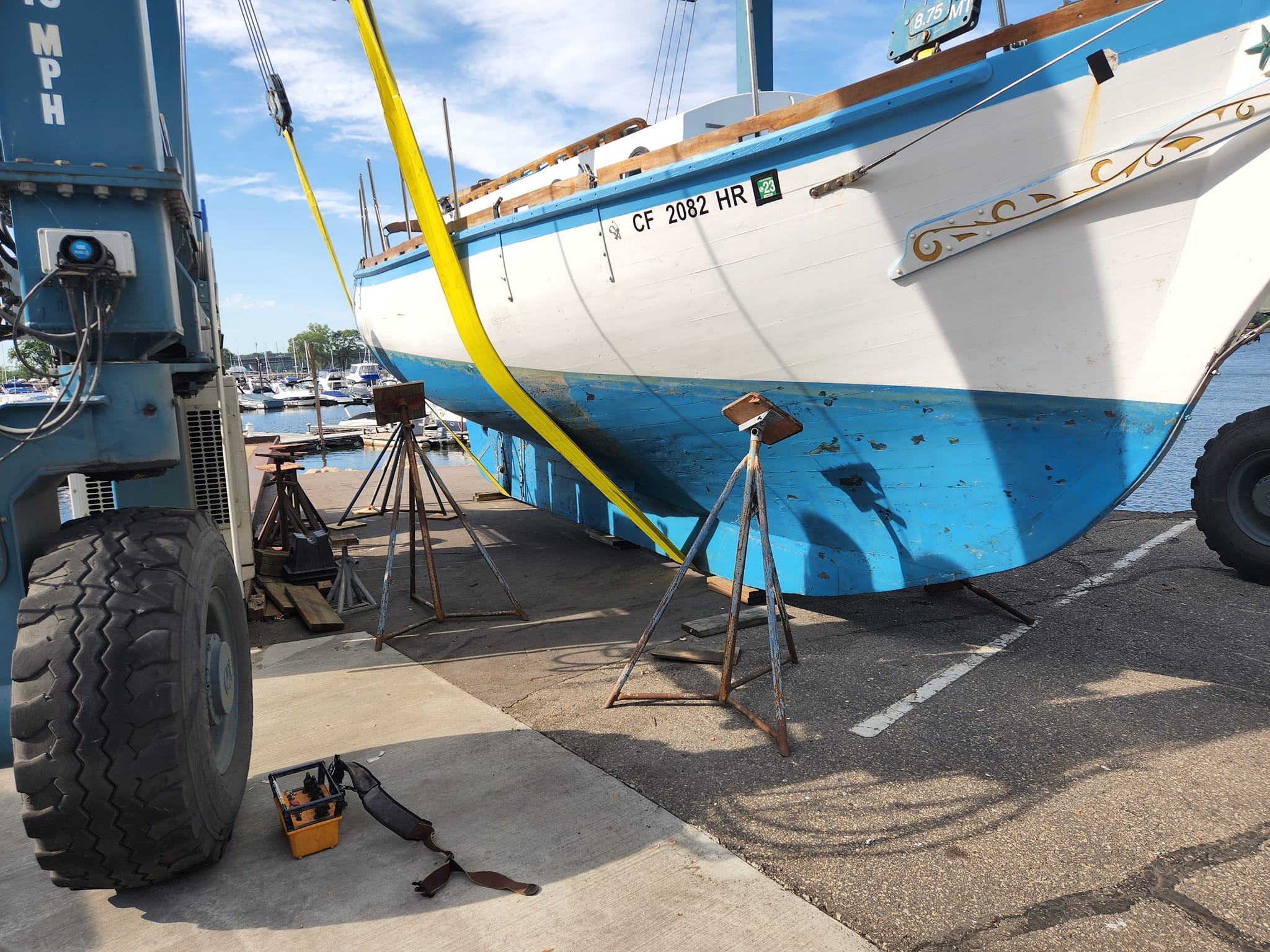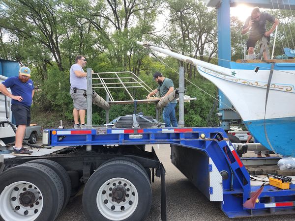 Golden Rule arrived at the St Croix Marina in Hudson, WI around 9 am on Sept 2 as planned. Dave, other boat yard people, Collin Mueller and Justin Farner got the pulit and rowboat off and we all moved the masts off of the truck.